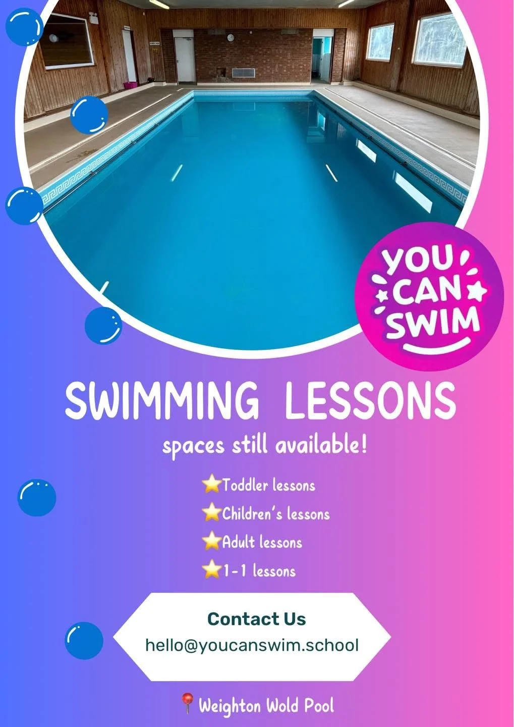 Whether you’re bringing your baby for their first splash or learning to swim as an adult, we’re here to help. At You Can Swim, we teach all ages and abilities in a fun, relaxed environment — with lessons tailored to each swimmer’s needs.